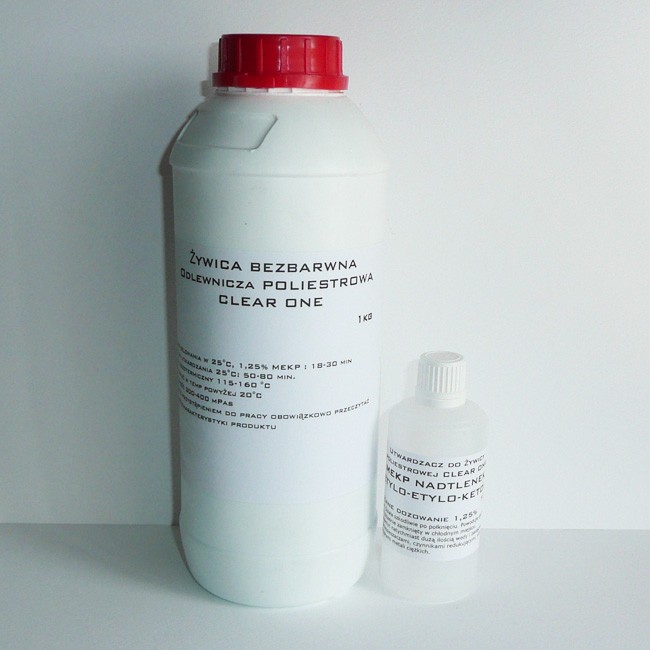 Żywica odlewnicza CLEAR ONE (1kg żywicy + 40g katalizatora MEKP) jest żywicą poliestrową posiadającą najwyższy poziom transparentności z pośród żywic dostępnych na rynku. Jest specjalnie modyfikowana dzięki czemu odlewy z tej żywicy posiadają identyczny współczynnik załamania światła co szkło. Odporna na promieniowanie UV, nie żółknie tak szybko pod wpływem czasu.Stosowana do wykonywania odlewów wszędzie tam gdzie potrzebujemy  wysoki poziom transparentności. W zestawie dołączony jest katalizator.