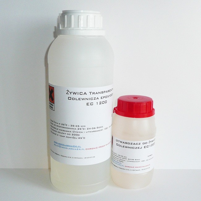 Żywica epoksydowa odlewnicza EC1200 (0,6kg żywicy + 0,192 utwardzacza) jest żywicą charakteryzującą się wysokim poziomem transparentności. Posiada niską lepkość przez co dobrze się ją odpowietrza oraz długi czas utwardzania co wpływa na niski pik temperaturowy. Żywica epoksydowa odlewnicza EC1200 jest stosowana do wykonywania odlewów wszędzie tam gdzie potrzebujemy wysoki poziom transparentności. Służy w modelarstwie, jubilerstwie w pracach plastycznych i artystycznych. Na bazie tej żywicy wykonuje się bransolety, kaboszony, wszelkiego rodzaju inkluzje. Odlewy z tej żywicy można obrabiać mechanicznie, wiercić, szlifować, polerować. Ze względu na niski skurcz przetwórczy dokładnie odwzorowuje kształt formy.