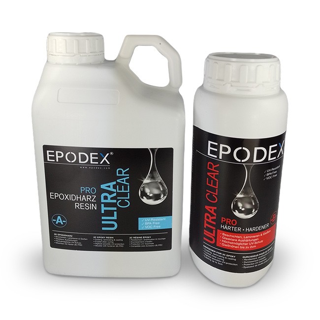 EPODEX ULTRA CLEAR PRO + PRO jest systemem epoksydowym krystalicznie bezbarwnym (jak woda) złożonym z żywicy oraz utwardzacza mieszanych w prostych proporcjach wagowych 100:50. System przeznaczony jest do pokrywania, laminowania, naprawy, klejenia, impregnacji oraz odlewania przedmiotow do grubości 2cm przy jednej warstwie. Możliwośc zmiany koloru poprzez zastosowanie barwników i pigmentów.  Uzyskana powierzchnia żywiczna charakteryzującą się wysoką twardością i połyskiem oraz dużą odpornością na ścieranie. Przy powierzchniach lub przedmiotach użytkowych gdzie występuje duże ryzyko uszkodzeń w celu zwiększenia odporności na oddziaływanie wysokich temperatur oraz zarysowań zaleca się pokrycie powierzchni żywicznej lakierem lub dwu-składniowym twardym woskiem.