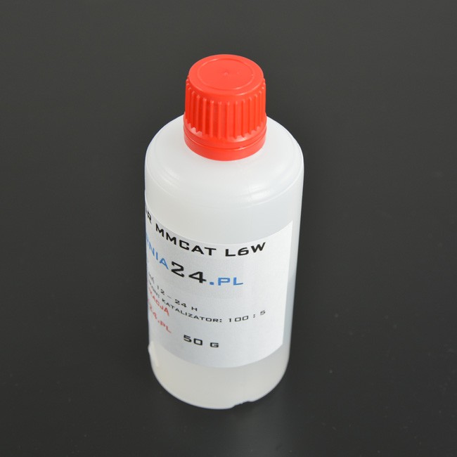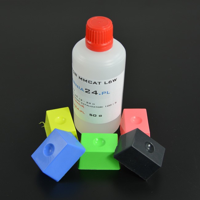 Katalizator MM CAT L6W jest to środek inicjujący proces sieciowania silikonów serii MM900, 50 gram katalizatora wystarcza do utwardzenia 1kg silikonu. Sam katalizator jest bezbarwny dlatego po jego zastosowaniu otrzymujemy białą bazę silikonu, ktory następnie może być poddawany barwieniu na dowolony kolor za pomocą pigmentów koloryzujących.