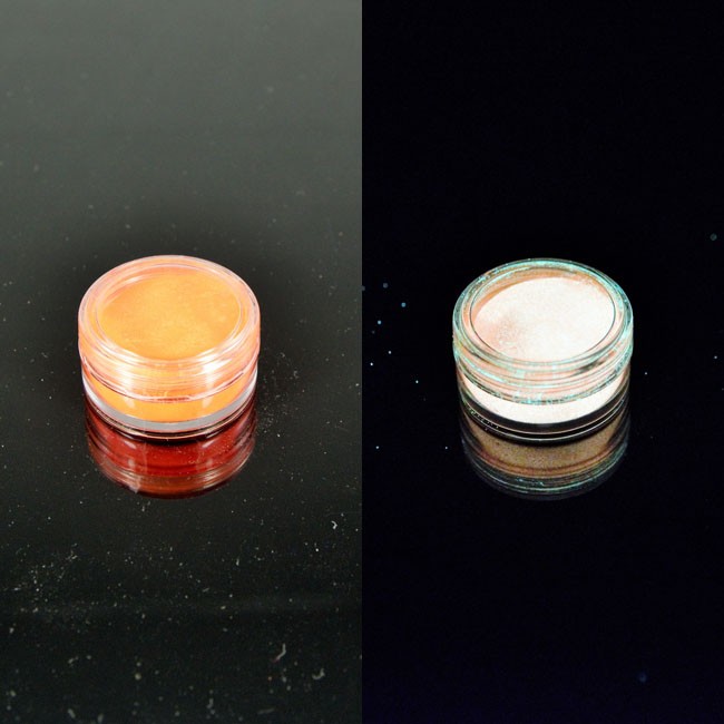 Pamiętaj, że każdy z pigmentów fotoluminescencyjnych inaczej wygląda za dnia a inaczej świeci po zmroku. Prezentowane zdjęcia z lewej strony ukazują wygląd pigmentu przy świetle dziennym natomiast po prawej stronie ukazany jest efekt świecenia po zmroku. Dla przykładu pigment świecący na niebiesko po zmroku, za dnia ma naturalny wygląd przypominający jasny piasek a więc jeżeli decydujesz się aby twój odlew, farba lub lakier również w trakcie dnia posiadała określony kolor np. niebieski do bazy poza samym pigmentem fotoluminescencyjnym musisz dodać odrobinę barwnika semitransparentnego perłowo metalicznego serii STAR DUST aby odlew nabrał koloru również w oświetleniu dziennym. Istnieją również pigmenty fotoluminescencyjne, które np. po zmroku emitują określony kolor, np. pomarańczowy oraz są same w sobie barwnikami tj. potrafią zabarwić masę żywiczną, farbę, lakier etc… na określony kolor, przykładem może być kolor pomarańczowy. Poniżej specyfikacja w/w. Uwaga – Zdjęcia mogą odbiegać kolorystycznie od finalnego wyniku wybarwienia ze względu na ustawienia rozdzielczości monitora i naświetlenia.