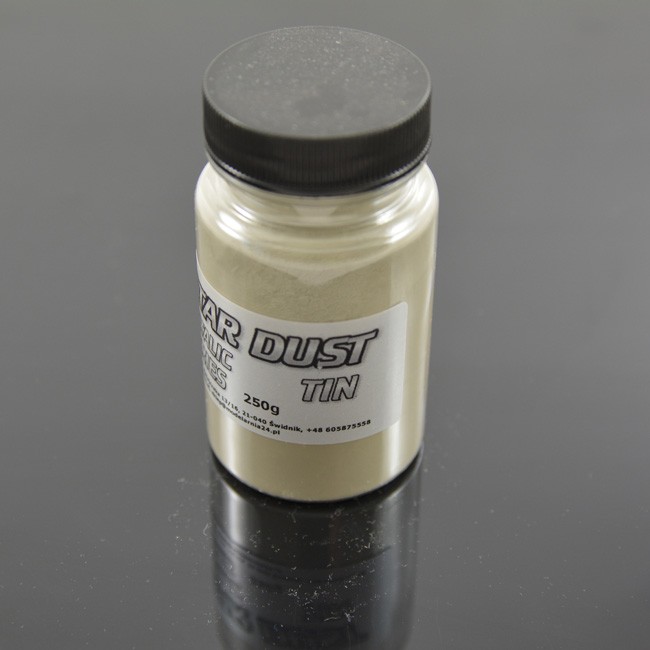 Proszek Cyny 0,25kg – jest to dodatek do żywic w formie drobno zmielonej cyny. Stosowany jako wypełnienie do żywic w celu wykonywania odlewów imitujących swoim wyglądem elementy z prawdziwego metalu.