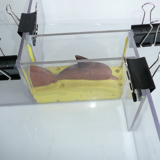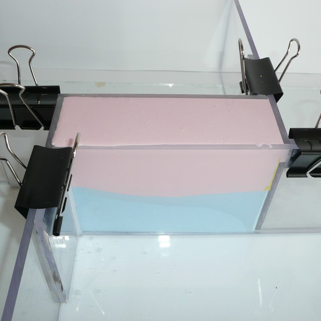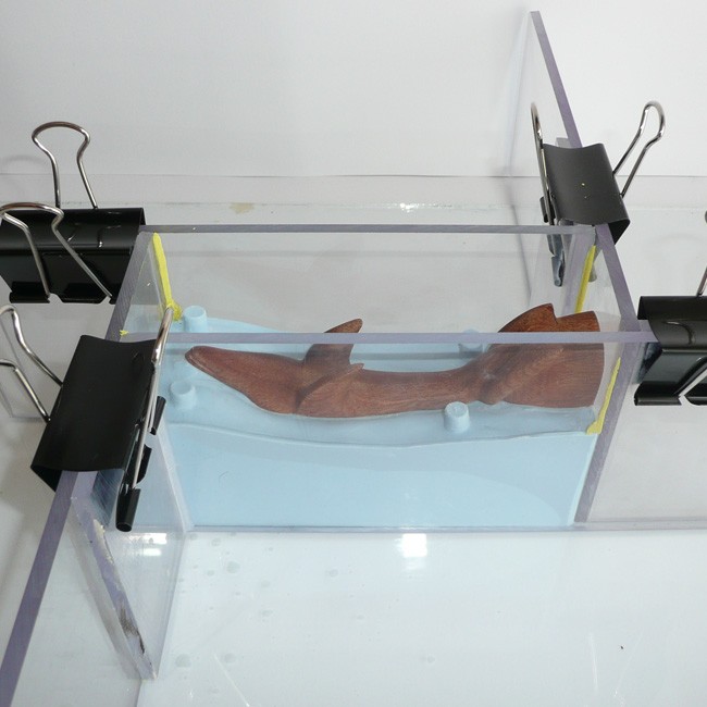 3. Odgazowany silikon jest już gotowy do zalania, wykonując tą czynność pamiętajmy aby zalewać formę/skrzynkę kierując strumień silikonu w jeden punkt, najlepiej gdy punkt ten ma najniższe położenie w formie. Zwracajmy uwagę aby podczas zalewania również przypadkowo nie wprowadzać powietrza do silikonu, starajmy się zalewać bardzo powoli, małym jednostajnym strumieniem.