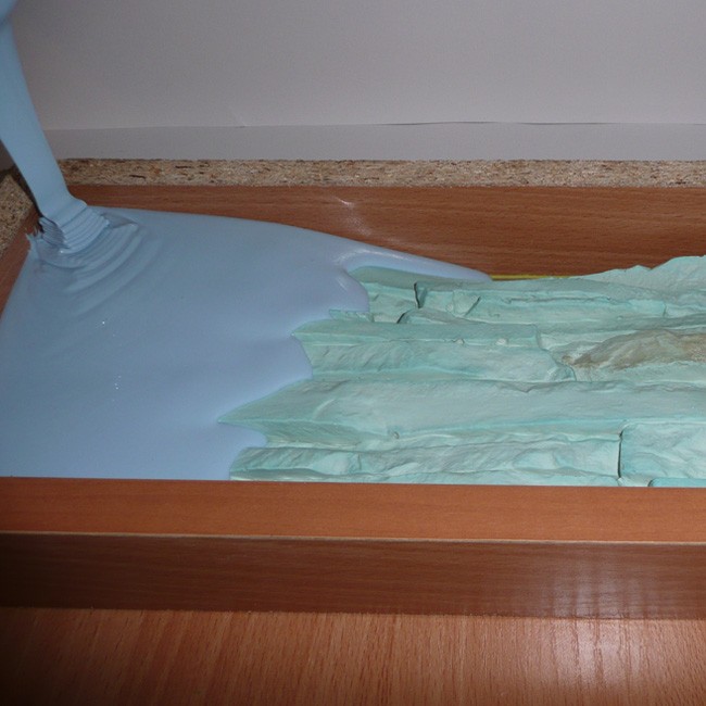 3. Odgazowany silikon jest już gotowy do zalania, wykonując tą czynność pamiętajmy aby zalewać formę/skrzynkę kierując strumień silikonu w jeden punkt, najlepiej gdy punkt ten ma najniższe położenie w formie. Zwracajmy uwagę aby podczas zalewania również przypadkowo nie wprowadzać powietrza do silikonu, starajmy się zalewać bardzo powoli, małym jednostajnym strumieniem.